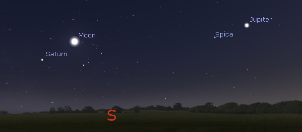 Let’s take our weekly look at the bright planets. Jupiter is in the southwest as it gets dark in the evening. The bright blue-white star Spica, which pales in comparison to Jupiter, is seen left of it. In even the smallest telescopes Jupiter’s four largest moons can be seen. They shift positions night from to night and sometimes even as you watch. Jupiter will set at 1:25 a.m. Saturn can now be seen in the evening as twilight fades in the south, tonight it’s just left of the bright waxing gibbous Moon. Saturn’s rings are spectacular in telescopes. In the morning sky, brilliant Venus will rise at 3:36 a.m. and be visible until about quarter to 6 tomorrow morning. Mars and Mercury are too close to the direction of the Sun to be seen.