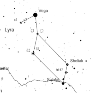 The Ring Nebula, M57 is small and cannot be seen with the naked eye or with binoculars, but it is still reasonably easy to find. A nebula is a cloud of gas and/or dust. M57 is in the constellation of Lyra the harp, a constellation visible in summer and early autumn. Point the telescope’s finder about half way between the two southern stars of the parallelogram of stars that’s the harp’s body, Sulafat and Sheliak. Move the telescope in a small spiral enlarging the search pattern by half the field of view at a time. The Ring Nebula will appear a ghostly small circular glow. Once centered, more magnification may be used. The center will be darker than the edge. Inside is a very faint invisible star that blew out its outer layers of gas into a smoke ring near the end of its life.