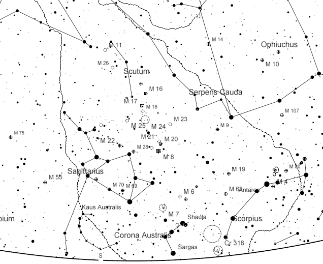 The Southern Milky Way contains lots of star clusters and nebulae. The chart below can be used to find the many Messier objects. Or just sweep through this gold mine of objects with binoculars or a low power telescope, most of which are in the next spiral arm in toward the center of the Milky Way. As far as the symbols go, open dotted circles are open or galactic star clusters. Crossed circles are globular star clusters. Squares are nebulae. M8, the Lagoon nebula, and M16 the Eagle nebula also contain star clusters. M8 and its associated star cluster appear as a horizontal spash of light in binoculars. As far as popular names go: M11 is the Wild Duck Cluster, M17 is the Omega or Swan Nebula, and M20 is the Trifid Nebula. An easy binocular star cluster is M7.