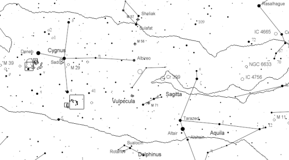 The Milky Way Overhead contains some notable deep sky objects. Note that the Milky Band splits here, though closer to the star Sadr in Cygnus than it shows here. The Dark expanse that runs through Aquila is called the Great Rift, and is caused by a cloud of dust and gas. Its edges can be probed with binoculars, especially in Aquila by watching star density drop off as one pans through the area. Don’t forget the blue and gold binary star Alberio. There’s another fainter blue and gold binary about a degree directly north of the Ring Nebula, M57. It’s 8th magnitude. The unmarked planetary nebula just above the second ‘l’ in Vulpecula is M27, the Dumbbell nebula. The other Messier (M) numbers are relatively easy to find. The large nebula below Deneb is the North American Nebula which can actually be seen with the naked eye or with binoculars on a moonless night away from city lights. The three-part nebula below Cygni is the Veil Nebula, a supernova remnant and very hard to spot but doable. The cluster Cr 399 (Collinder 399 or Brocchi’s Cluster) is better known as the Coathanger and is best seen in binoculars or a telescope finder, which inverts it, making it a properly oriented hanger.