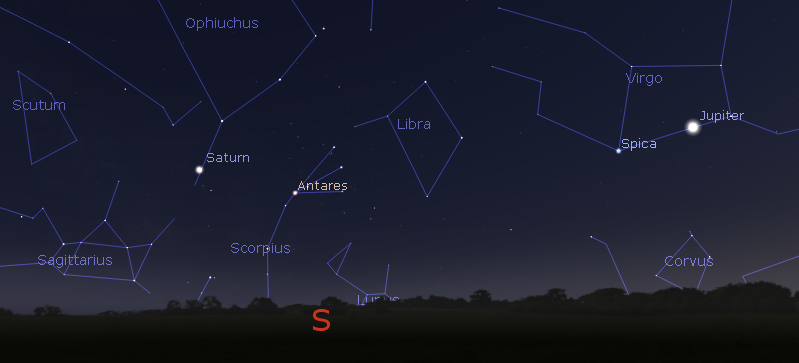 Jupiter and Saturn with the southern summer constellations at 10:30 p.m., July 12, 2017. Created using Stellarium.