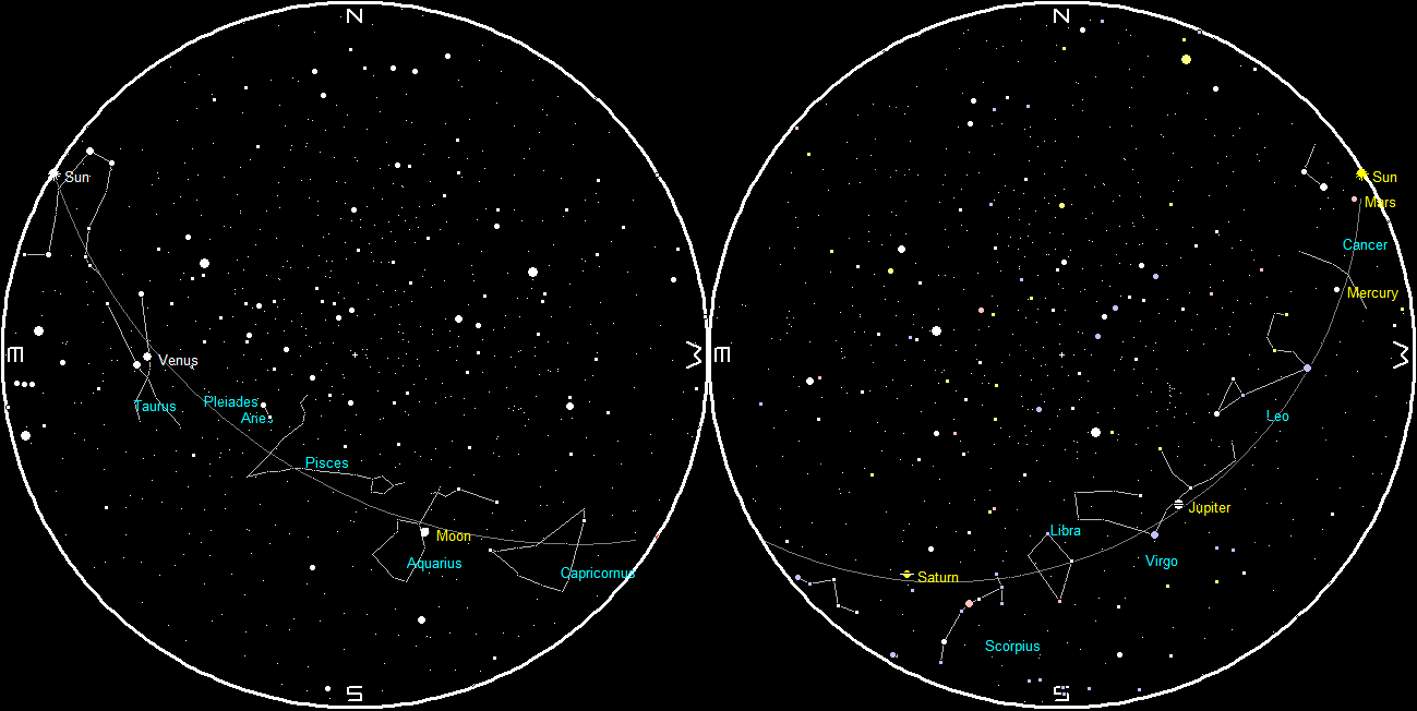 Planets at sunset and sunrise of a single night starting with sunset on the right on July 12, 2017. The night ends on the left with sunrise on July 13. Click on the image to enlarge. Created using my LookingUp program.