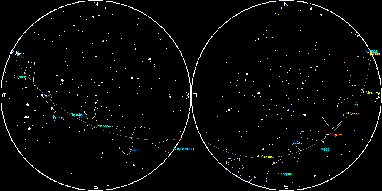 Let’s take our weekly look at the bright planets. Jupiter is sinking in the west-southwest as it gets dark in the evening. The bright blue-white star Spica, which pales in comparison to Jupiter, is seen left of it. In even the smallest telescopes Jupiter’s four largest moons can be seen. They shift positions from night to night. Jupiter will set at 12:06 a.m. Saturn can now be seen in the south as evening as twilight fades. The reddish star Antares is off to the right of Saturn. Saturn’s rings are spectacular in telescopes. Saturn will set at 3:17 a.m. In the morning sky, brilliant Venus will rise at 3:25 a.m. and be visible until about quarter to 6 tomorrow morning. Mars is in conjunction with the Sun today, that is it’s almost directly behind the Sun, For the last week and the next, no commands will be sent to the orbiters and rovers on Mars due to the radio interference of the Sun.