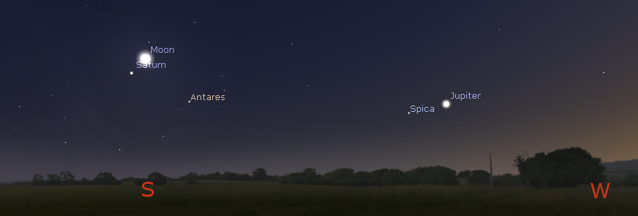 Jupiter, Saturn and the Moon at 10 p.m., August 2, 2017. Created using Stellarium. Click on image to enlarge.