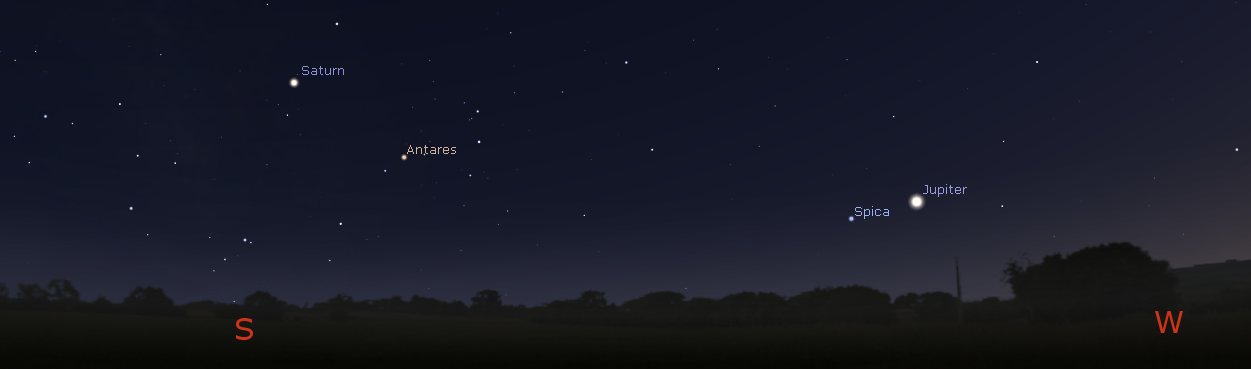 Jupiter and Saturn at 10 p.m. August 9, 2017. Jupiter is slowly approaching Saturn in our skies and will pass Saturn on December 21, 2020, and every 20 years for the rest of this century. Created using Stellarium. Click on the image to enlarge.