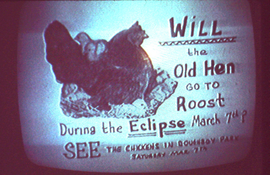 The local baseball park hosted a menagerie of chickens and other animals for folks could watch their eclipse antics. Also there was an ABC television crew, whose normal job was to televise golf tournaments. The big TV camera, they were big in those days, was placed on a fork lift to tilt it back far enough to reach the Sun. Scattered on the ground were lots of 2×2 inch black squares with holes in them. It turns out they were neutral density filters that they were inserting in the camera, near the focal plane. Of course the concentrated sunlight near the focal plane would burn through the filter in nothing flat. Some of the younger members in our group had created exposed x-ray film for filters, and showed the TV crew how to fasten the filters in front of the camera lens. It worked, but the guys in the TV van outside the stadium complained that something was wrong with the filters, because there were black spots on the Sun. They were of course sunspots.