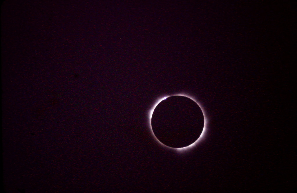 The brief world of solar eclipse totality is one everyone should experience at least once in their lifetime. For this eclipse Totality will last from 2 minutes, and 5 seconds on the Oregon coast to 2 minutes 40 seconds in Kentucky, down to 2 minutes 35 seconds on the South Carolina coast. And this is for the center of the path of totality. The duration of totality is so brief that one cannot really absorb it all. As the Moon covers the last of the Sun’s bright photosphere there is a chill as the Sun’s heat is extinguished. Darkness of a deep twilight descends. Street lights come on, cocks will crow, as animals take the darkness as the approach of night. The approaching shadow of the Moon can be seen. During totality the Sun’s corona can be seen as a silvery apparition around the black spot of the Moon that’s covering the Sun’s disk. Bright planets and some stars will appear in a surreal image in the darkened sky, but the horizon is bright. Then suddenly the diamond ring appears and it’s over.