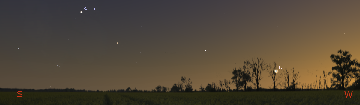 The setting Jupiter and Saturn at 8:30 p.m., September 13, 2017. Created using Stellarium. Click on image to enlarge.