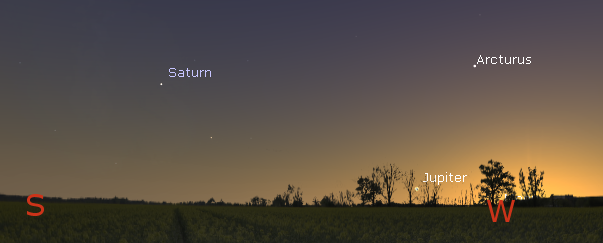 The setting Jupiter and Saturn at 8:15 p.m., September 20, 2017. Created using Stellarium. Click on the image to enlarge.
