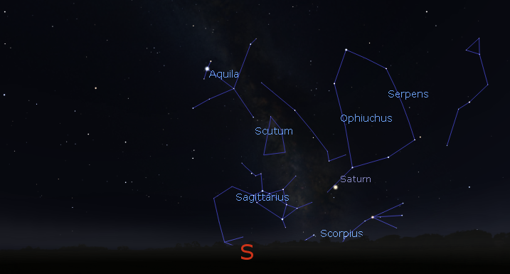 Saturn and constellations in dark skies at 9 p.m. September 20, 2017. Created using Stellarium. Click on the image to enlarge.