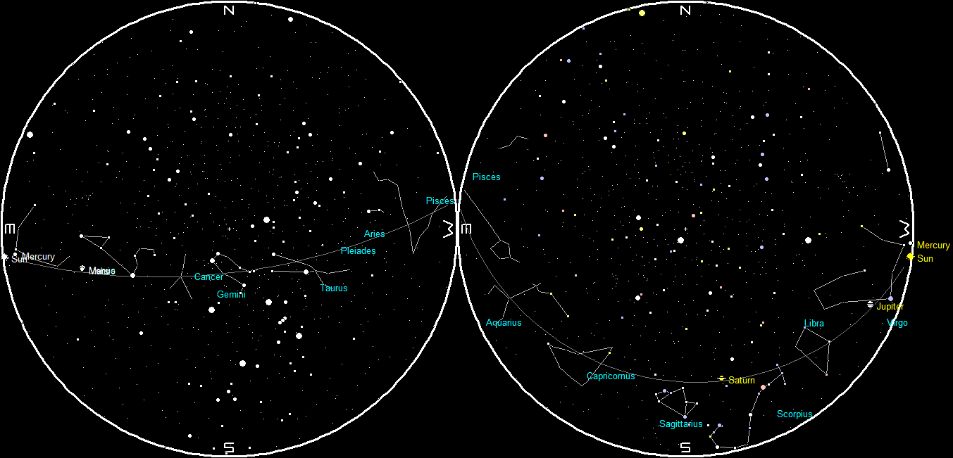 Planets at sunset and sunrise of a single night starting with sunset on the right on October 4, 2017. The night ends on the left with sunrise on the 5th. The full Moon has fallen in the cracks between the sunset and sunrise charts due to its position south of the ecliptic. Click on the image to enlarge. Created using my LookingUp program.