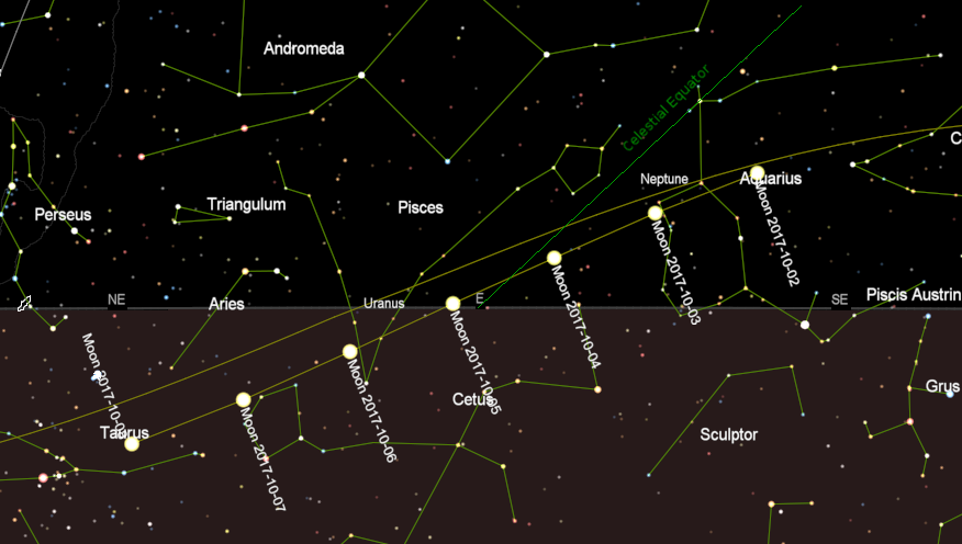 The position of the Moon for 7 nights centered on moon rise tonight (10/04/2017). The rotation of the Earth carries the Moon to rise parallel to the green celestial equator line. The brown area at the bottom is below the horizon. Click on the image to enlarge. Created using Cartes du Ciel (Sky Charts).