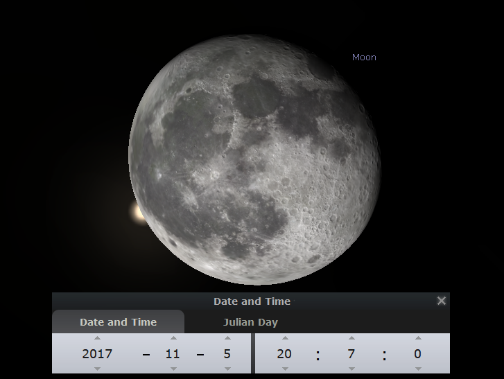 Otherwise use a planetarium program like Stellarium to preview the event. However, set the program for topocentric coordinates. In Stellarium that’s in the Configuration window, Tools Tab and check the Topocentric coordinates box. Topocentric coordinates are the apparent positions for your location on the Earth. So also make sure your location is correct. The geocentric conjunction of the two bodies will be November 6, 2:42.9 UTC, so it will occur after midnight on the morning of November 6th for locations in northern Europe and Asia.