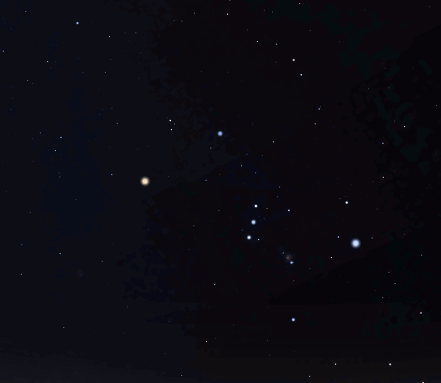 Off in the east-southeast at 9 in the evening the great constellation of Orion will be seen. This is the most famous of all constellations world-wide. We think the Big Dipper is a big deal. It’s not even a constellation, being the hind end of the great bear Ursa Major. Also it’s invisible if one travels far enough south of the equator. Orion is now a rectangle of stars tilted to the left as he rises. With three stars in a straight line in the center, his belt. They are aligned nearly vertically. Orion is a giant hunter. The rectangle depicts his shoulders and knees. Among its other bright stars Orion contains two of the brightest. The upper left star is the famous red giant star Betelgeuse. The lower left star is the blue-white super giant Rigel.
