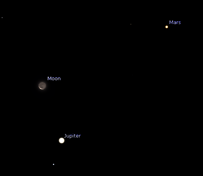The Moon, Jupiter and Mars this morning, December 14, 2017. Earth shine should be visible as shown, though not as prominent. Created using Stellarium.