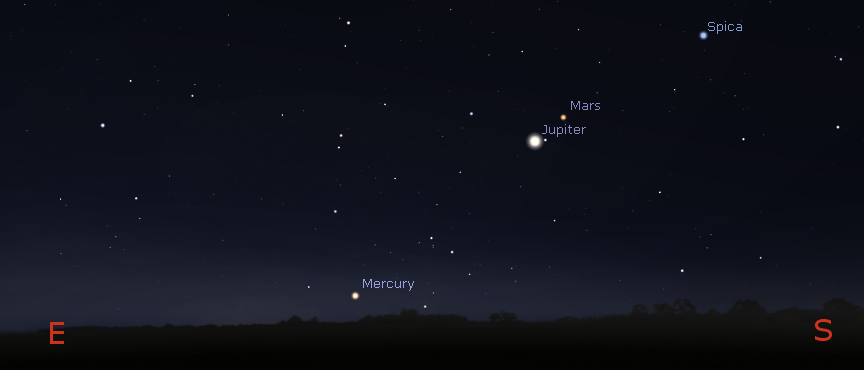Let’s take our weekly look at the bright planets. While Uranus and Neptune are evening planets, they require binoculars or a telescope to spot. All of the bright naked eye planets are in the morning sky now, However Saturn and Venus, the brightest are too close to the Sun to be seen. At 7 this morning Mars is in the south-southeast while Jupiter is a lot brighter and below and left of it. Mars will rise tomorrow morning at 3:49. It’s approaching Jupiter which will rise 23 minutes later at 4:12. Mercury will be a challenge to spot, rising in the east-southeast at 6:32 a.m. both today and tomorrow. At 7 a.m. It will require a low horizon, binoculars and luck to find. In its next evening appearance in March it will be placed much higher in the sky for the same twilight conditions.