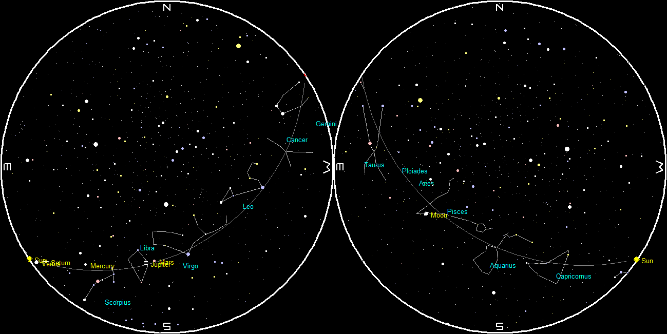Planets at sunset and sunrise of a single night starting with sunset on the right on December 27, 2017. The night ends on the left with sunrise on the 28th. Click on the image to enlarge. Created using my LookingUp program.