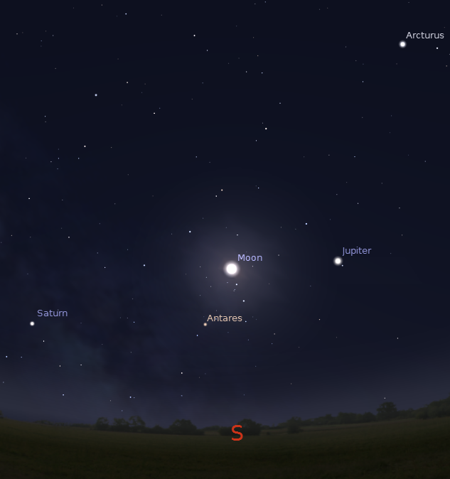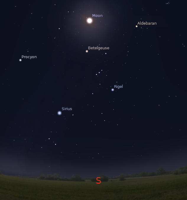 The exact time that the Moon will be fill, at least to the nearest minute is 9:24 tonight. Ever notice the placement of the full moon in the sky between winter and summer? The Full moon near the winter solstice moves very high at midnight, while the full moon near the summer solstice is seen quite low in the south. For the Moon to be full, it most be nearly opposite the Sun in the sky, so we see it fully illuminated as the Sun does. The Moon’s orbit is close to the Sun’s apparent path in the sky, the ecliptic, which is the projection of the Earth’s orbit of the Sun. So the Moon now is near where the Sun will be 6 months from now in late June, high in the sky. Next full moon we will see a lunar eclipse.