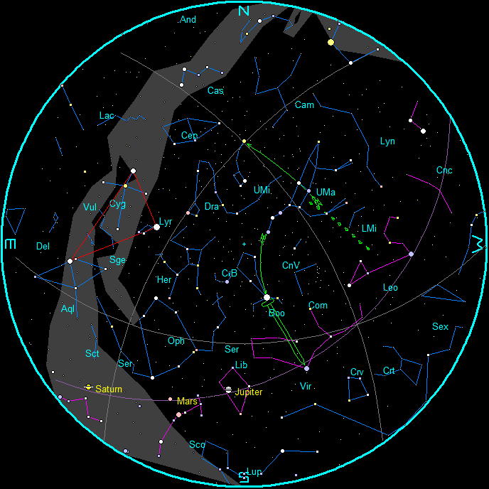 The planets and stars are plotted for the 15th at 9 p.m. EST in the evening and 6 a.m. for the morning chart. These are the chart times. Note that Traverse City is located approximately 45 minutes behind our time meridian. (An hour 45 minutes behind our daylight saving time meridian. during EDT and 45 minutes behind our daylight standard time meridian. during EST). To duplicate the star positions on a planisphere you may have to set it to 1 hour 45 minutes (Daylight Time) or 45 minutes (Standard Time) earlier than the current time if you are near your time meridian.