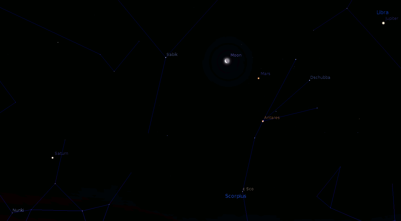 This past Wednesday morning the Moon passed Jupiter, Earlier this morning the Moon passed north of Mars, and on Sunday morning Saturn will appear south of The Moon. There is a once in about 2 year event, that is red Mars passing Antares, the red giant star in Scorpius, one of the easiest constellations to spot because it actually resembles a scorpion. The name Antares means “Rival of Mars” because they have the same color: Ant meaning anti and Ares is the Greek god of war and counterpart of the Roman god Mars. Mars will pass Antares on average of