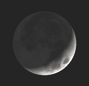 The waxing crescent Moon as it might be seen in binoculars at 9 p.m. tonight. March 21, 2018. Created using Stellarium.