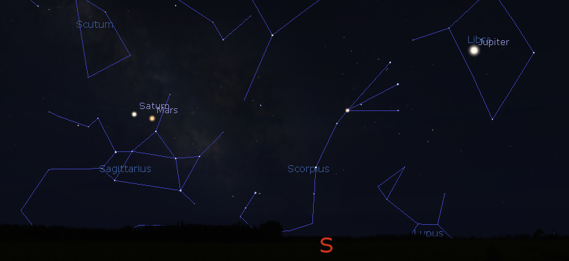 Let’s take our weekly look at the bright planets. We’re down to 4 the naked eye planets are visible now. One is in the evening sky. Venus will be visible low in the Western twilight from about 8:30 p.m. until before it sets at 9:43. Mercury is heading between the Earth and the Sun, not directly but will enter the morning sky Sunday. It’s morning appearance later next month will not be a good one for us in the northern hemisphere. Late this evening Jupiter will rise at 11:46. Mars will rise at 3:23 a.m. Saturn will end the procession, rising 3 minutes later. At 6 tomorrow morning these three planets will be strung across the southern sky. Bright Jupiter will be in the south-southwest, dimmer Mars will be in the south-southeast, just right of and a bit below Saturn.