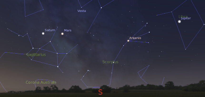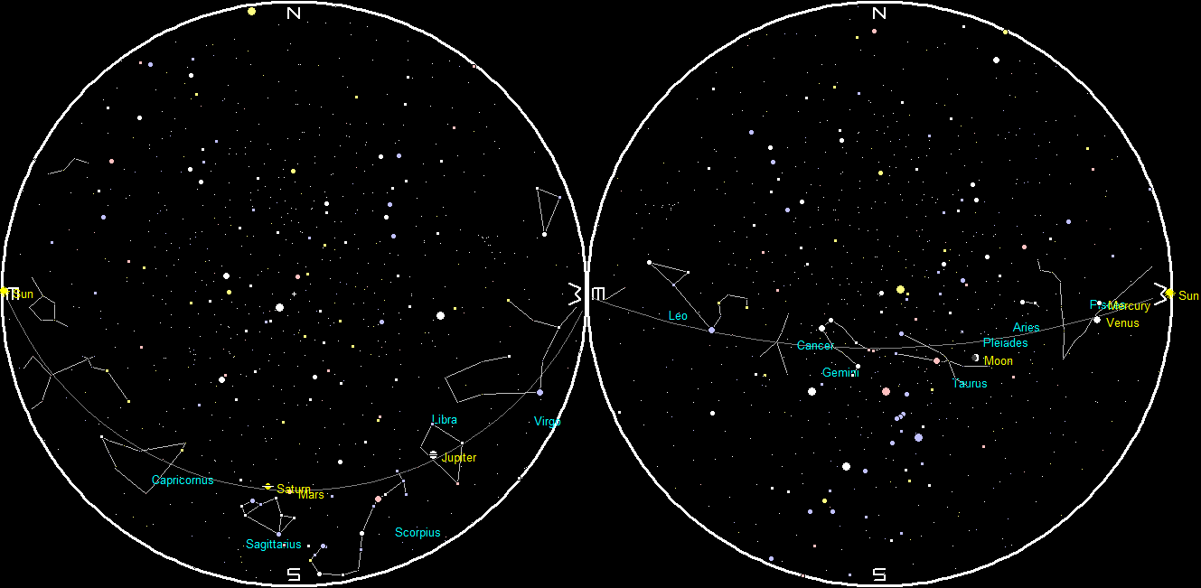 Note the chart times of 10 p.m. and 5 a.m. are for the 15th. For each week before the 15th add ½ hour (28 minutes if you’re picky). Watch out for the time change. For each week after the 15th subtract ½ hour. The planet positions are updated each Wednesday on this blog. For planet positions on dates other than the 15th, check the Wednesday planet posts on this blog.