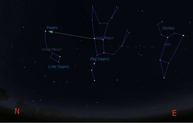 The Big Dipper points to Polaris, the, North Star, and to Leo the lion at 9 p.m., March 13th. In another hour the 4th brightest night-time star Arcturus will appear above the eastern horizon pointed to by the arc of the handle of the Big Dipper. We’ll revisit the Big Dipper next month when Arcturus and Spica will also be found by the use of the Big Dipper. Created using Stellarium and Libre Office.