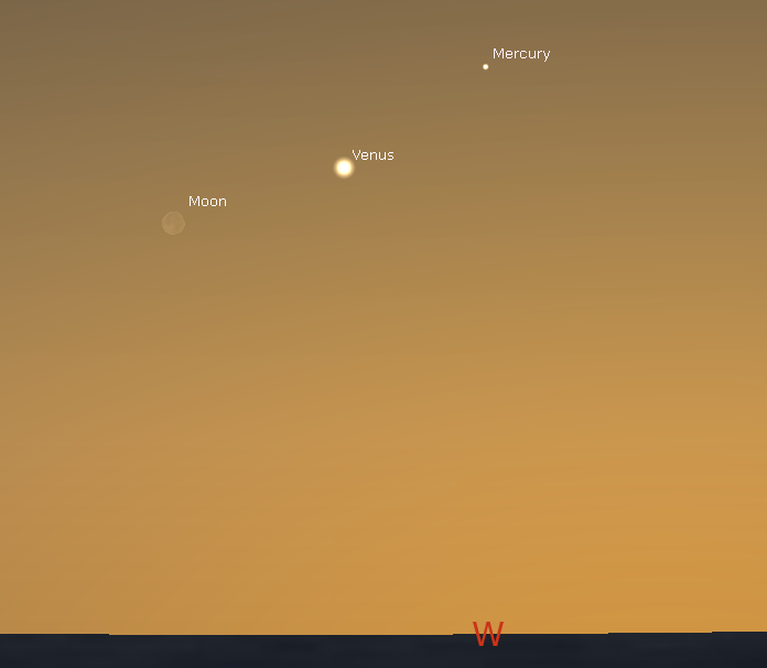 Today the planet Mercury will be at its greatest separation east from the Sun. It is called its greatest eastern elongation from the Sun. It is at an angle of 18.4 degrees from the Sun. It will be seen in the west about 8:15 for about an hour before it sets. It will be above right of the much brighter Venus. Mercury is probably at its best place to be observed than any time this year, with eastern elongation happening near the vernal equinox and is placed at a high angle above the Sun. The best morning appearance of Mercury will be its greatest western elongation on August 26th, almost a month short of the autumnal equinox, where it won’t be placed at as great an angle above the rising Sun.