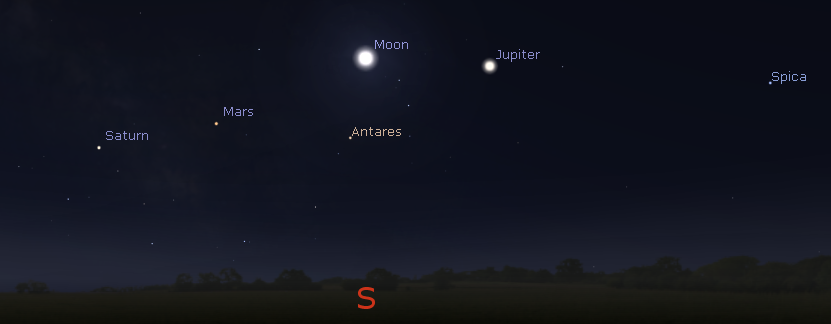 The morning planets of Jupiter, Mars and Saturn plus the Moon. Seen at 6 a.m. tomorrow morning March 8, 2018. Click on image to enlarge. Created using Stellarium.
