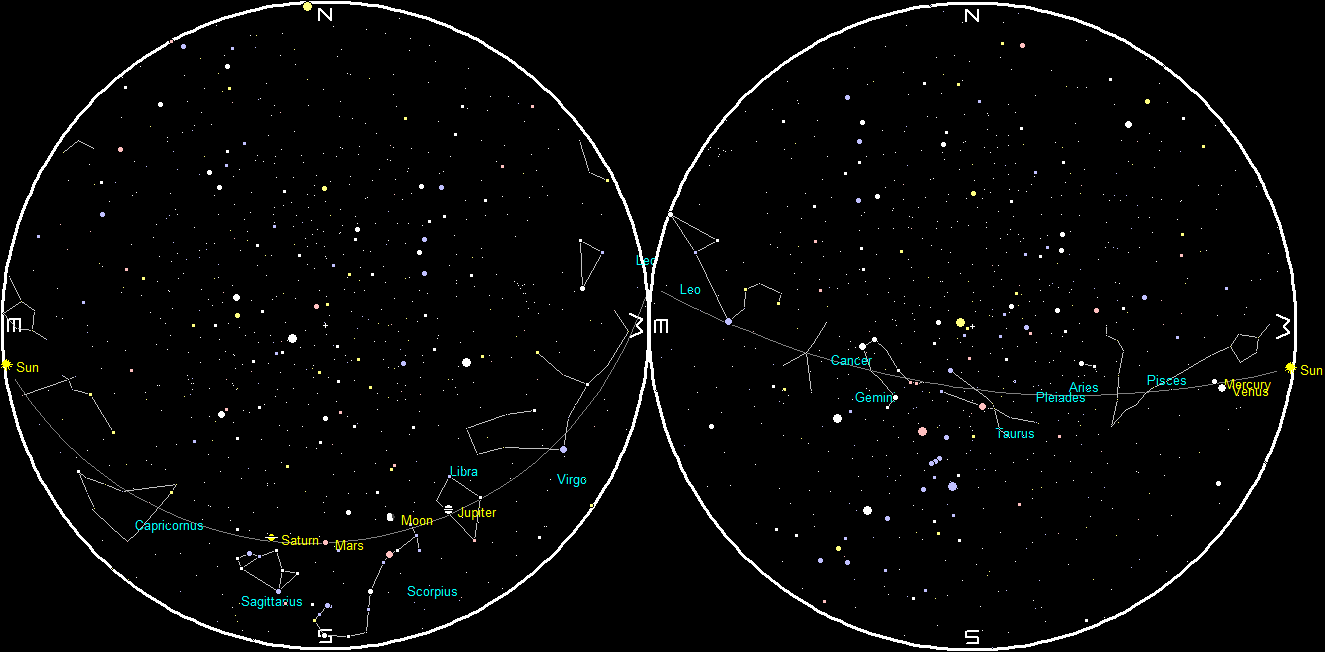 Planets at sunset and sunrise of a single night starting with sunset on the right on March 7, 2018. The night ends on the left with sunrise on the 8th. Click on the image to enlarge. Created using my LookingUp program.