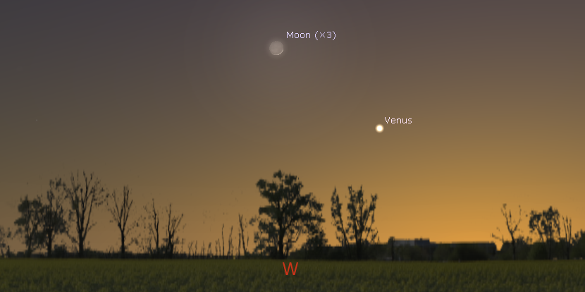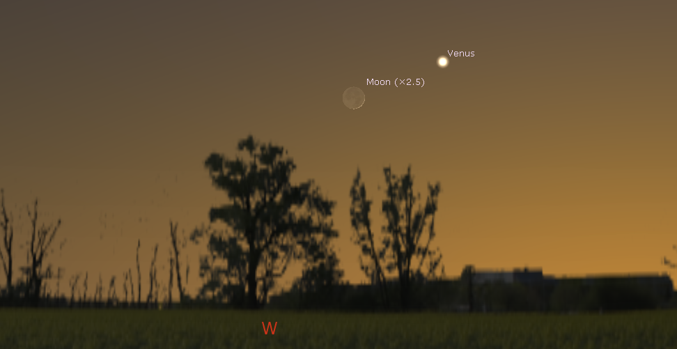 Venus and the Moon in evening twilight at 9 p.m, tonight April 18, 2018. The Moon is shown at 3 times its actual size for clarity. Click on the image to enlarge. Created using Stellarium.