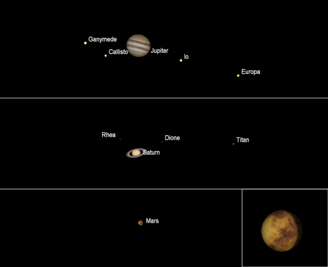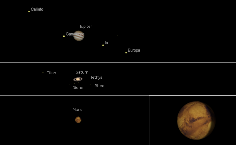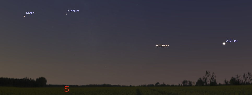 At 6 tomorrow morning these three planets will be strung across the southern sky. Bright Jupiter will be in the southwest, dimmer Mars and Saturn will be in the south, with Mars to the left of Saturn in the morning twilight.