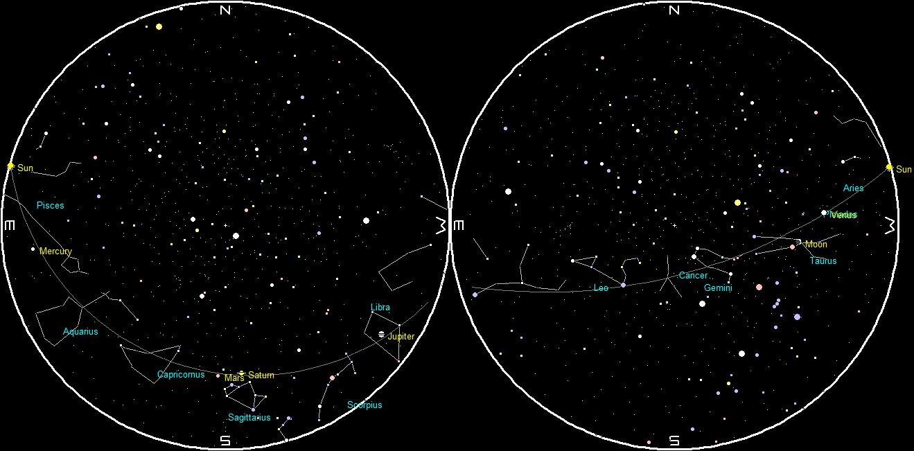 This evening, while viewing Venus the Moon will be to the left and below our evening star. It will be a thin sliver of a crescent and in the twilight there will be the suggestion that there is more than the thin sliver of the Moon visible. Binoculars will confirm that the entire disk of the Moon will be visible. The effect is called earthshine. The nearly full Earth is illuminating the Moon to a much greater degree than the full Moon illuminates the Earth. The ancients had a more beautiful way to put it: “The old Moon in the new Moon’s arms.” There is the same effect in the morning of the few days prior to the new Moon. The instant of new Moon occurred at 9:57 p.m. Eastern Daylight Time Sunday night the 15th. That’s the 16th according to Universal time. What does your calendar say?*