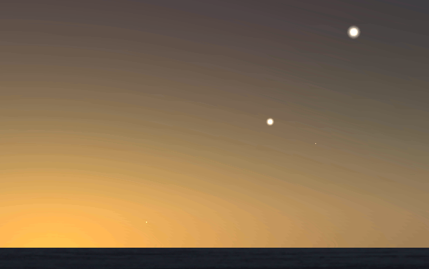 Jupiter will rise late this evening at 10:23 p.m. That doesn’t make it an evening planet. It has to rise before sunset to be an evening planet. Saturn will rise at 2:17 a.m., while Mars will rise at 2:52 a.m. At 6 tomorrow morning these three planets will be strung across the southern sky. Bright Jupiter will be in the southwest, dimmer Mars and Saturn will be in the south-southeast, with Mars to the left of Saturn in the morning twilight.