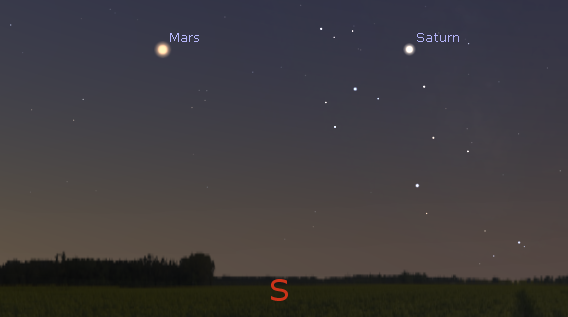 It’s Wednesday again and time to look for the bright planets. Two of them are in the evening sky. The brilliant beacon of Venus will be visible in the western twilight from about 9:25 p.m. until it sets at 11:44. Jupiter will be low in the southeast as it gets dark. Jupiter is only out shown by Venus and the Moon. And after Venus sets will have the night to itself as the brightest star-like object. Binoculars will show it to be not quite star-like in size, that is it will appear as a tiny orb. It will be accompanied by several satellites which will shift positions night to night. Saturn will rise at 12:12 a.m. in the east-southeast. Mars will rise at 1:46 a.m. and is now outshining Saturn, and will, this summer even outshine Jupiter.