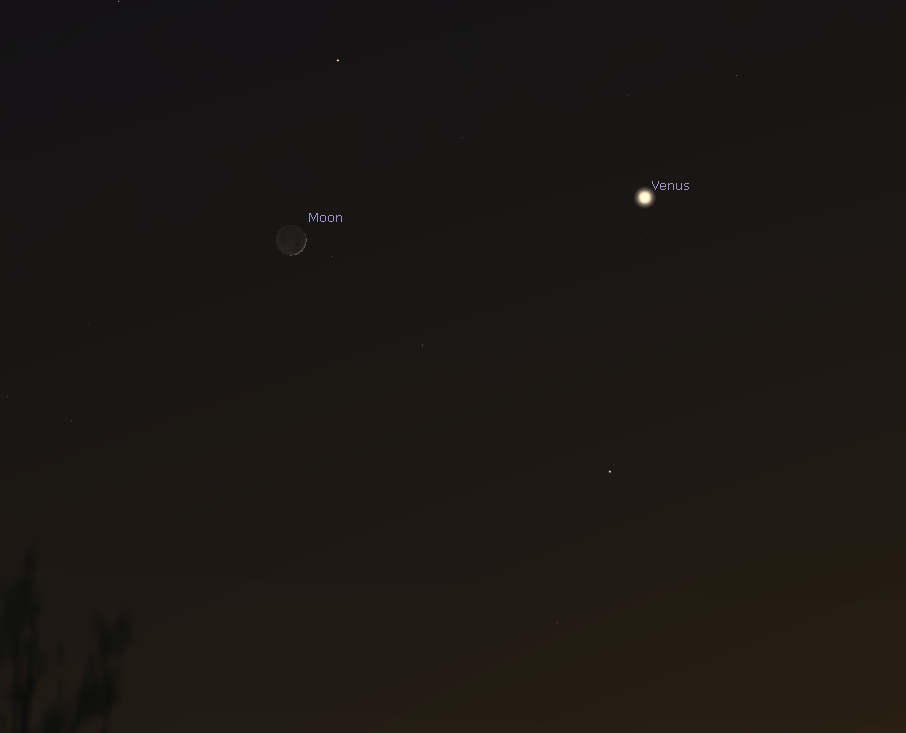 This afternoon at 2:11 the Moon will appear to pass Venus. This will be impossible to see since the Moon is going to be much dimmer than Venus. Venus can indeed be seen in the daylight. I’ve seen it many times with binoculars or a telescope, but only once with the naked eye. The latter time was not long before sunset. It is essential that to spot Venus in the daytime by any of these means that one is in the shade, by putting the Sun behind a building, and knowing where Venus is supposed to be using a program on a smart phone. By tonight the Moon will have moved eastward past Venus by up to 13 of its diameters and will also be displaying earthshine, the reflection of the Earth off its night side.