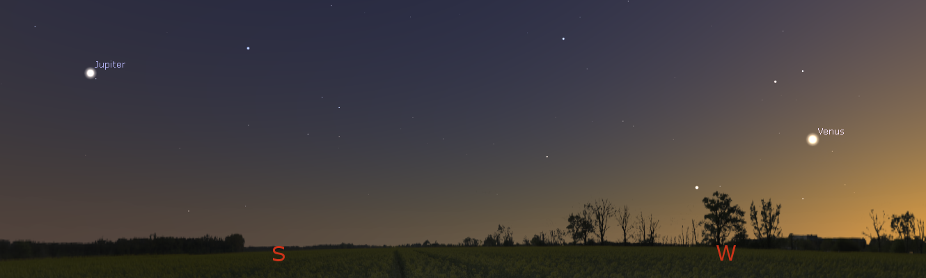 Venus and Jupiter tonight May 30 2018. at 10 p.m. Click on image to enlarge. Created using Stellarium.