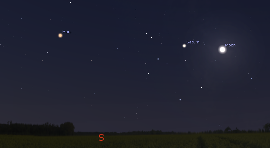 It’s Wednesday again and time to look for the bright planets. Two of them are in the evening sky. The brilliant beacon of Venus will be visible in the western twilight from about 9:40 p.m. until it sets at 12:04 a.m. Jupiter will be in the southeast as it gets dark. Jupiter is only outshone by Venus and the Moon. And after Venus sets will have the night to itself as the brightest star-like object until it sets at 5:02 a.m. Binoculars will show it to be bigger than star-like in size, that is it will appear as a tiny orb flanked by little star-like moons. Saturn will rise at 11:14 p.m. in the east-southeast. Mars will rise at 1:28 a.m. and is now outshining Saturn, and will, this summer even outshine Jupiter.