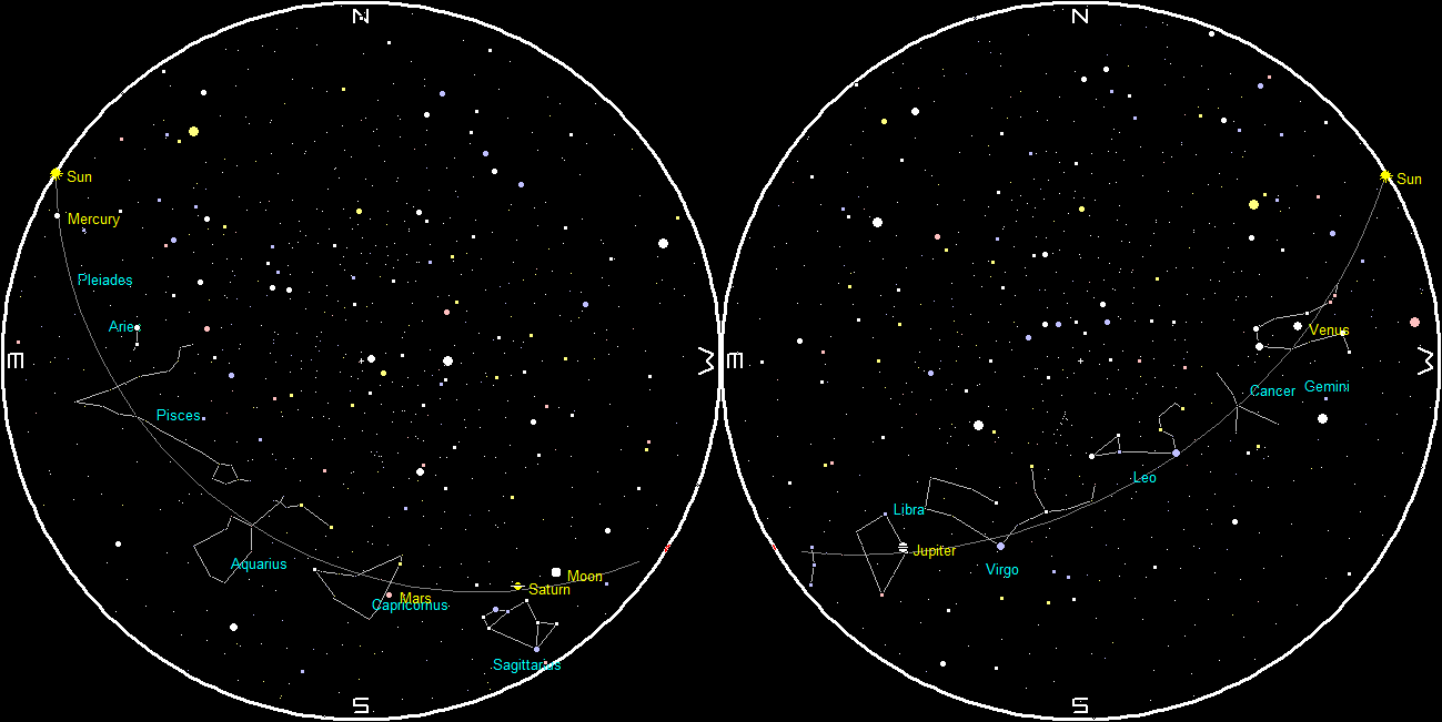 Planets and the Moon at sunset and sunrise of a single night starting with sunset on the right on May 30, 2018. The night ends on the left with sunrise on the 31st. Click on the image to enlarge. Created using my LookingUp program.