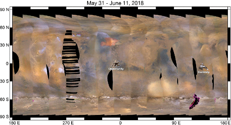 An animation of Mars global scans by the Mars Reconnaissance Orbiter over the period of May 31 to June 11, 2018. Two dust storms, one from the north, and another from the south converge and threaten to go global. Click on the image to enlarge. Credit: NASA/JPL-Caltech/MSSS.