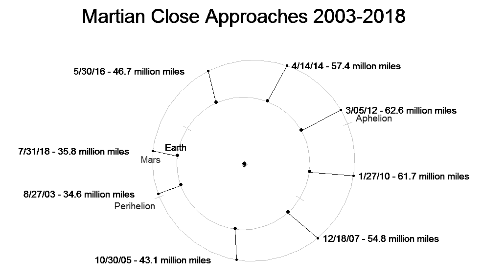 Mars closest approaches to the Earth from August 27, 2003 to July 31, 2018. Diagram created using Bob Moler’s LookingUp program.