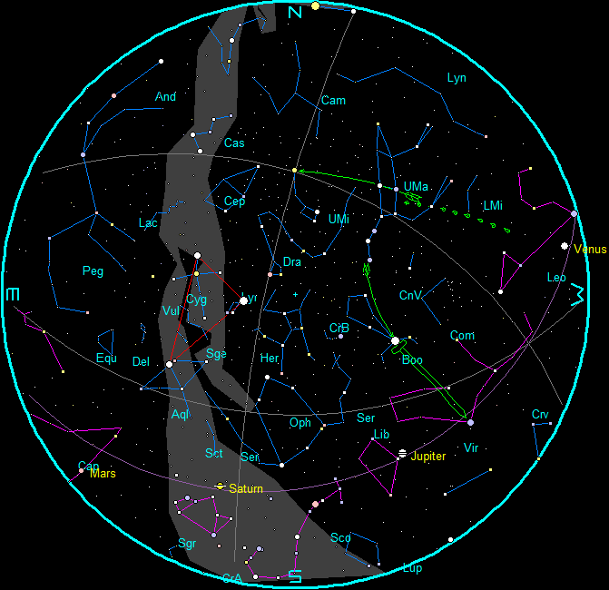 Note the chart times of 11 p.m. and 4:30 a.m. are for the 15th. For each week before the 15th add ½ hour (28 minutes if you’re picky). For each week after the 15th subtract ½ hour. The planet positions are updated each Wednesday on this blog. For planet positions on dates other than the 15th, check the Wednesday planet posts on this blog.