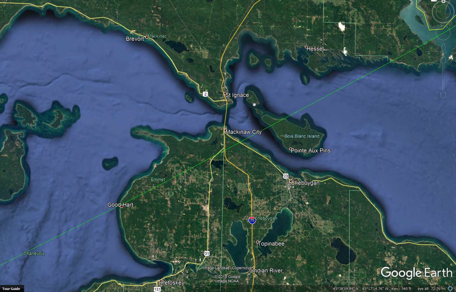 The Straits of Mackinac area showing the green southern graze line of the Occultation of Aldebaran. Credit Map Google Earth, Graze line by Occult 4.