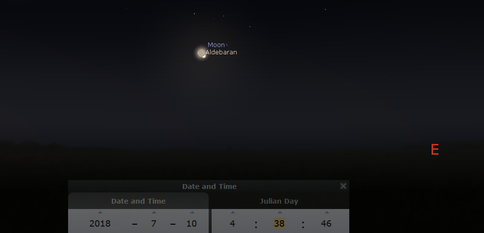 Location of the Moon and Aldebaran in the sky at 4:38 a.m. July 10, 2018 from the Interlochen/Traverse City area.