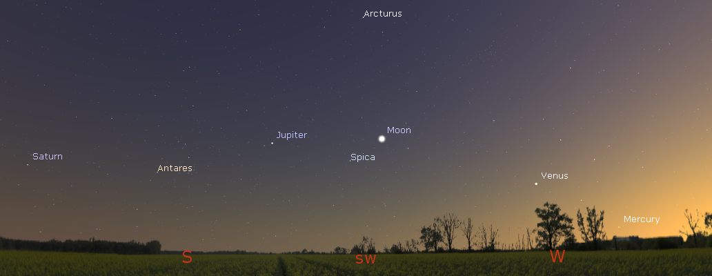 Evening planets from Mercury to Saturn and Moon at 9:50 p.m., July 18, 2018. Click on image to enlarge. Created using Stellarium.