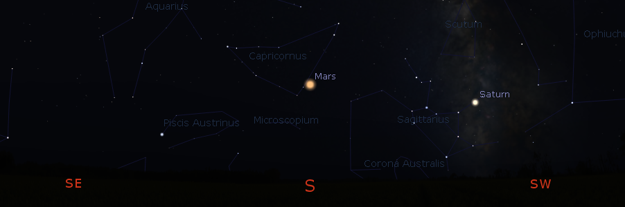 Mars at its highest in the south with Saturn at 2:35 a.m. Click on image to enlarge. Created using Stellarium.