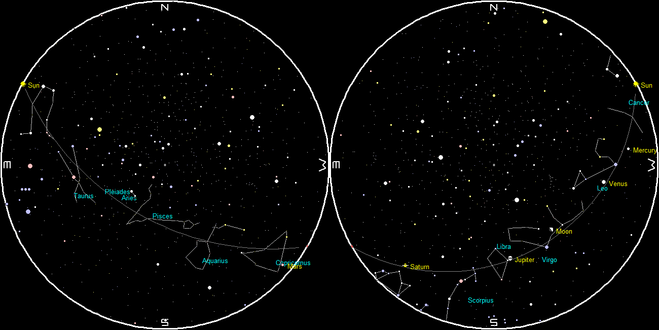 It’s Wednesday and time to look for and at the bright planets. Four of them are in the evening sky. The brilliant beacon of Venus will be visible in the western twilight from about 9:40 p.m. until it sets at 11:21 p.m. Mercury, is fading and is far below and right of Venus, setting at 10:18 p.m. Jupiter will be in the south as it gets dark. It is only outshone by Venus, the Moon, and for a few weeks by Mars at its closest. Jupiter will set at 1:42 a.m. Saturn will start the evening low in the southeast and will stay relatively low, above the Teapot of Sagittarius. It will be due south at 12:14 a.m. and will set at 4:40 a.m.. Mars will rise at 10:20 p.m. and is now only 36.8 million miles (59.2 million km) away, in telescopes it appear to be 23.7″ (seconds of arc) in diameter. It will be due south and at its highest in the sky at 2:35 a.m. at 21 degrees altitude.