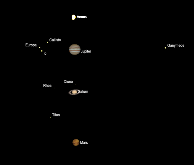 Telescopic view of Jupiter, Saturn and Mars at 11 p.m. on July 18. All at the same magnification. Created using Cartes du Ciel (Sky Charts).