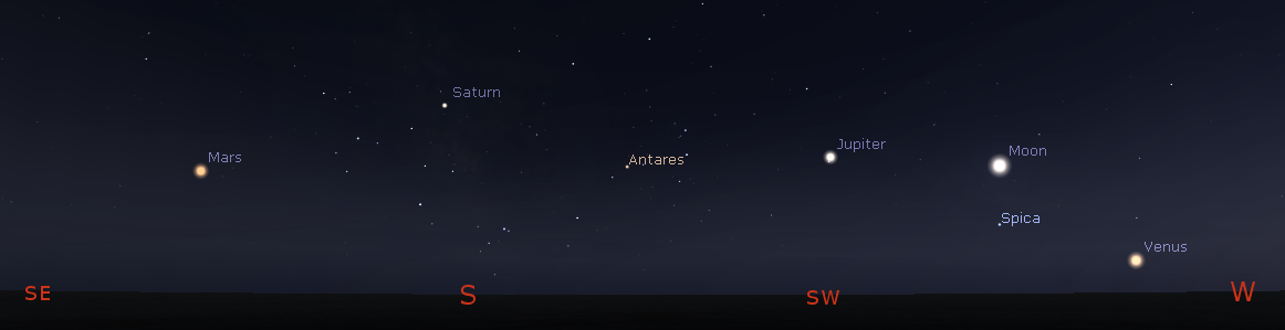 It’s Wednesday and time to look for and at the bright planets. Four of them are visible in the evening sky. The brilliant Venus will be visible in the western twilight from about 9:10 p.m. until it sets at 10:20 p.m. Jupiter will be in the southwest as it gets dark. It is only outshone by Venus, the Moon, and currently Mars. Jupiter will set at 11:52 p.m. Saturn will start the evening low in the southern sky and will stay relatively low, above the Teapot of Sagittarius. It will be due south at 10:18 p.m. and will set at 2:43 a.m.. Mars will be low in the southeast as the skies darken tonight. and is now 37.3 million miles (60.1 million km) away. It will set at 4:21 a.m. It is being slowly left behind by the faster moving Earth.